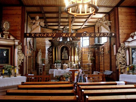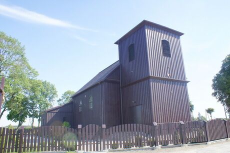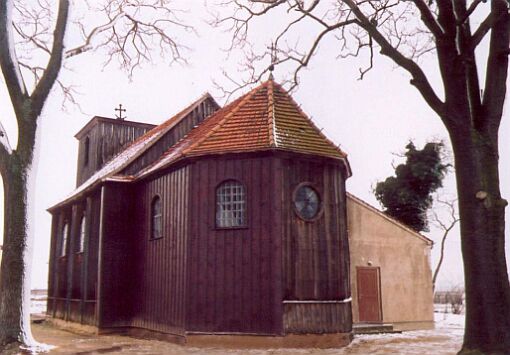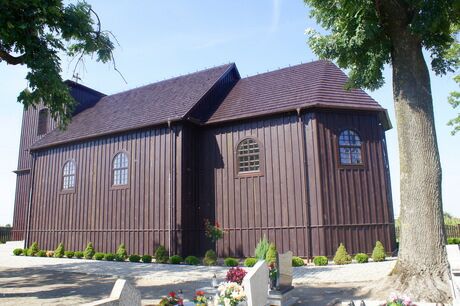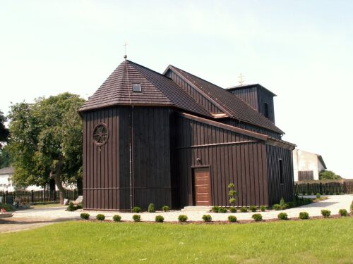 (fot. Piotr Kiciński - 2011) Położenie. Wieś w gm. Dominowo, 8 km na pn. – wsch. od Środy. Historia. Kościół p.w. Świętej Katarzyny Panny i Męczenniczki z 1751 r. Zbudowany z fundacji Franciszkanów. W 1937 r. obniżono wysokość wieży. Dobudowa murowanej zakrystii w 1992 r. Remontowany w latach 2010 – 11. Budowa i wyposażenie. Kościół drewniany, jednonawowy konstrukcji zrębowej. Orientowany, zbudowany na podmurówce z cegły. Mniejsze prezbiterium od nawy, zamknięte trójbocznie z boczną zakrystią. Wieża od frontu, konstrukcji słupowej, dwukondygnacyjna z kruchtą w przyziemiu. Zwieńczona prawie płaskim dachem z krzyżem. Dzwon z 1749 r. Dach dwukalenicowy, kryty gontem. Wnętrze wyłożone boazerią. Strop płaski wspólny dla nawy i prezbiterium. Chór muzyczny wsparty na dwóch słupach z parapetem lekko wybrzuszonym w części środkowej. Belka tęczowa z krucyfiksem i rzeźbami anioł z 2 poł. XVI w. Ołtarz główny z 2 poł. XVII w. Dwa ołtarze boczne z XVIII w. Także warto zobaczyć. Dworek z p. XX w. Literatura. [2][6][13] |