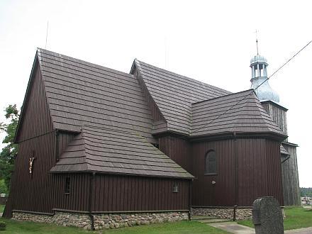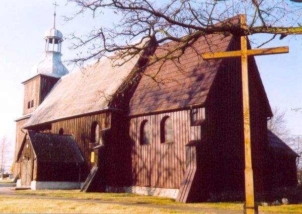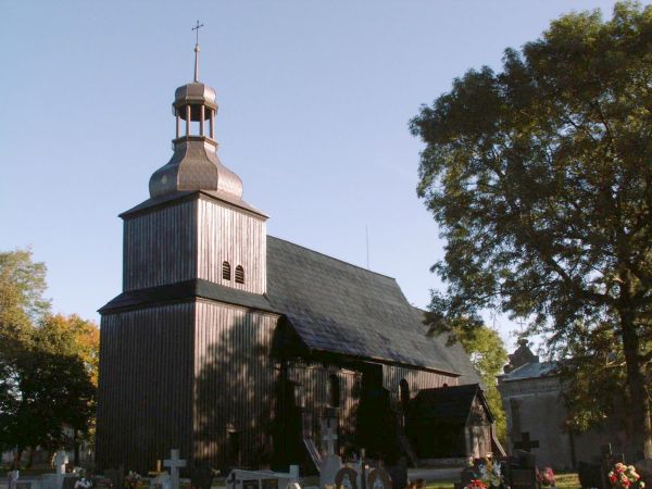 (reprodukcja - Katalog Zabytków Sztuki - Powia Słupecki - 1960) Położenie. Wieś w gm. Strzałkowo, 8 km na pd. – zach. od Słupcy. Historia. Kościół p.w. Świętej Małgorzaty z 1 poł. XVI w. Datowany często na rok ok. 1520. Zbudowany z fundacji Wilibrordusa Młodziejewskiego. W poł. XVII w. (prawdopodobnie w 1678 r.) dobudowano kaplicę p.w. Świętego Izydora Oracza, fundowaną przez Krzysztofa Marszewskiego. W latach 1759 – 66 rozbudowano nawę, dobudowano wieżę. Remontowany w 1852, 1937 r. W 1968 r. wymiana gontu na eternit. Generalny remont wykonano w latach 2005 – 08, nowe gonty. W 2021 r. w prezbiterium odkryto polichromię datowaną na XIV w., dalsze badania pozwolą zweryfikować datę budowy kościoła. Budowa i wyposażenie. Kościół drewniany, jednonawowy konstrukcji zrębowej. Orientowany, zbudowany na podmurówce kamiennej. Prezbiterium mniejsze od nawy, zamknięte prostokątnie z boczną zakrystią. Z boku nawy kaplica zamknięta trójbocznie, o kalenicy niższej od nawy i kruchta. Wieża kwadratowa od frontu, dwukondygnacyjna konstrukcji słupowo – ramowej. Zwieńczona blaszanym, barokowym hełmem baniastym z latarnią. Dach dwukalenicowy, kryty gontem. Wewnątrz pozorne sklepienie kolebkowe w prezbiterium, a w nawie z imitacją kasetonów z rozetami i kaplicy strop płaski. Chór muzyczny z parapetem o prostej linii i z prospektem organowym. Podłoga wyłożona parkietem. Niedawno odkryta polichromia w prezbiterium datowana jest na XIV w. Przedstawia sceny z życia Jezusa: Narodziny, Chrzest, Kuszenie na Pustyni, Nauczanie w Świątyni Jerozolimskiej oraz Śmierć Judasza. Wczesnobarokowe: ołtarz główny z 1 poł. XVII w. i w kaplicy z 1650 r. Dwa ołtarze boczne barokowe z k. XVII w. Ambona, chrzcielnica drewniana i krucyfiks barokowe z 2 poł. XVII w. Chrzcielnica kamienna, gotycka z 1522 r. Renesansowa ława kolatorska z 1588 r., zdobiona malowidłami o motywach roślinnych i herbami szlacheckimi. Epitafium renesansowe namalowane w 1584 r. dla rodziny Młodziejewskich. Obok kościoła murowana kaplica z poł. XIX w., grobowiec rodziny Hulewiczów. Ogrodzenie z kamienia polnego i cegły. Także warto zobaczyć. Park z wieloma okazami drzew i dwoma alejami: grabową i wiązową. Literatura. [1][2][5b][6][A. C. Nowak; Słupca – Pyzdry – Zagórów; COIT; Poznań 1987 r.] |