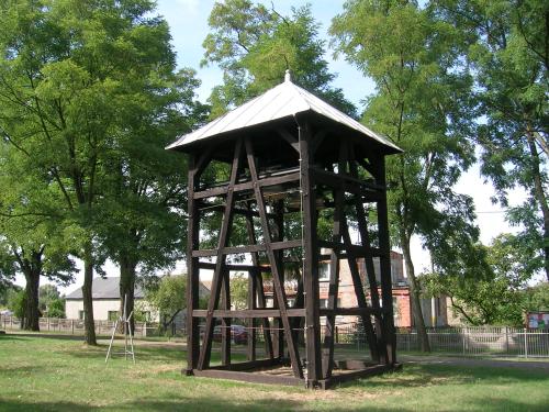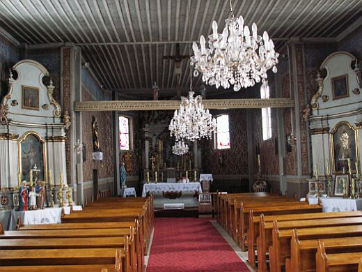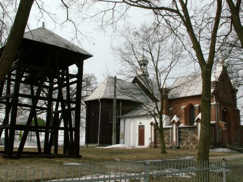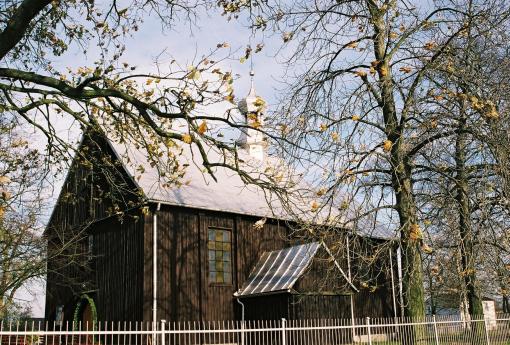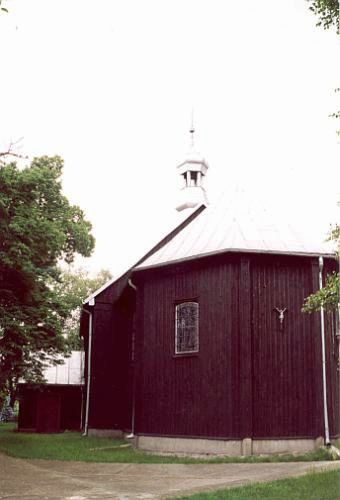 (fot. Piotr Kiciński - 2006) Położenie. Wieś w gm. Blizanów, 20 km na pn. od Kalisza. Historia. Kościół p.w. Świętego Stanisława Biskupa z 1753 r. Zbudowany z fundacji Eleonory Lipskiej, później Lubomirskiej cześnikowej koronnej. Murowana zakrystia z k. XVIII w. Restaurowany w 1859 r. W 1897 r. dobudowano murowaną, neogotycką kaplicę dla rodziny Radońskich. Odnowiony w 1990 r. Budowa i wyposażenie. Kościół drewniany, jednonawowy konstrukcji zrębowej. Orientowany. Mniejsze prezbiterium od nawy, zamknięte trójbocznie. Połączone murowane zakrystia i kaplica i drewniana kruchta, po bokach nawy. Dach dwukalenicowy, kryty blachą z sześcioboczną wieżyczką na sygnaturkę. Zwieńczoną cebulastym, blaszanym hełmem z latarnią. Wewnątrz stropy płaskie. Chór muzyczny wsparty na dwóch słupach z rokokowym prospektem organowym. Belka tęczowa z barokową z Grupą Pasyjną z 1 poł. XVIII w. Polichromia z 1978 r. Scena Zdjęcia Ciała Chrystusa na ścianie. Ołtarz główny i dwa ołtarze boczne rokokowe z 2 poł. XVIII w. Chrzcielnica barokowa z rzeźbą Chrztu Chrystusa z 2 poł. XVIII w. Rzeźba MB późnogotycka z ok. 1500 r. Dzwonnica drewniana, ażurowa z 2 poł. XVIII w., konstrukcji słupowej. Kryta dachem namiotowym z blachą. Murowana plebania z poł. XIX w. Także warto zobaczyć. Literatura. [1][2][6] |