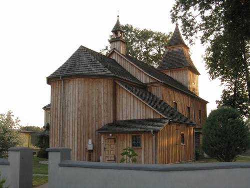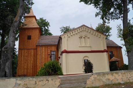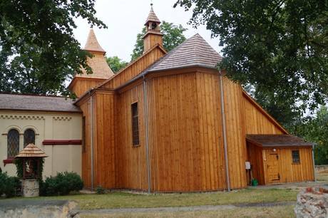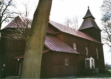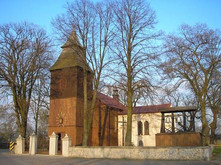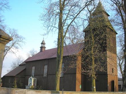 ![]() (fot. Michał Rychlik - 2008) ![]() (fot. Michał Rychlik - 2008) ![]() (fot. Michał Rychlik - 2005) ![]() (fot. Michał Rychlik - 2005) ![]() (fot. Sylwia Piekarek - 2015) ![]() (fot. Sylwia Piekarek - 2015) ![]() (fot. Michał Rychlik - 2017) ![]() (fot. Sylwia Piekarek - 2015) Położenie. Wieś w gm. Lutomiersk ok. 15 km na pn. – zach. od Pabianic. Historia. Kościół p.w. Narodzenia NPM, oraz Świętych Piotra i Pawła z 1712 r. Zbudowany z fundacji Józefa Skalińskiego. Przebudowany w 1774 r. Rozbudowany o wieżę w 1812 r. W 1880 r. dobudowano murowana kaplicę. Budowa i wyposażenie. Drewniany kościół, trójnawowy konstrukcji zrębowej. Orientowany. Mniejsze prezbiterium od nawy, zamknięte trójbocznie z boczną zakrystią. Wieża od frontu, kwadratowa z kruchtą w przyziemiu. Zwieńczona łamanym hełmem namiotowym. Murowana kaplica neogotycka z boku nawy. Dach dwukalenicowy, kryty gontem z kwadratową wieżyczką na sygnaturkę. Zwieńczoną hełmem ostrosłupowym z latarnią. Wnętrze podzielone na trzy części dwoma rzędami kolumn po cztery sztuki. Stropy płaskie. Chór muzyczny wsparty na czterech kolumnach z klasycystycznym prospektem organowym o 10 głosach z warsztatu Dominika Biernackiego. Polichromia z lat 50 XX w. Postacie Świętych Piotra i Pawła. Ołtarz główny barokowy z p. XVIII w. Dwa ołtarze boczne wczesnobarokowe z p. XVII w., uzupełnione w k. XVIII w. W kaplicy ołtarz barokowy z 1640 r. Ambona i chrzcielnica barokowe. Konfesjonał z 2 poł. XVIII w. Kropielnica klasycystyczna. Wokół kościoła pomnikowe lipy. Dzwonnica drewniana z 1954 r. z trzema dzwonami z lat 50 XX w. Zbudowana na planie prostokąta, ażurowa w górnej części, kryta dachem dwuspadowym. Ogrodzenie murowane. Także warto zobaczyć. Literatura. [39] ![]() |