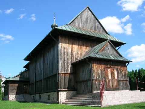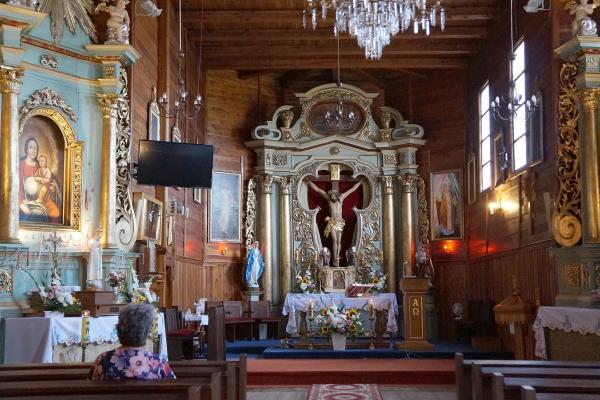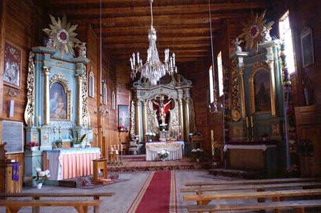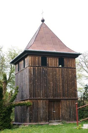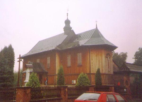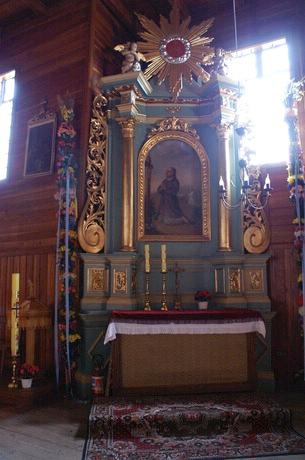 (fot. Sylwia Piekarek - 2010) Położenie. Wieś w gm. Czarnocin, ok. 12 km na pn. Kazimierza Wielka. Historia. Kościół p.w. Świętego Bartłomieja Apostoła z 1657 r. Zbudowany przez Władysława Myszkowskiego wojewodę krakowskiego. Rozbudowany w k. XIX w. – przedłużenie nawy. W 1941 r. zarekwirowano dzwon z 1923 r. Gruntownie przebudowany 1982 – 85 – nowa kruchta od frontu nawy. Remontowany w 2000 r. Budowa i wyposażenie. Drewniany kościół jednonawowy, konstrukcji zrębowej. Orientowany, zbudowany z drewna modrzewiowego. Mniejsze prezbiterium od nawy, zamknięte trójbocznie z boczną zakrystią. Kruchty od frontu i z boku nawy. Dach dwukalenicowy, kryty blachą miedzianą z ośmioboczną wieżyczką na sygnaturkę. Zwieńczoną cebulastym hełmem blaszanym z latarnią. Wewnątrz belkowe stropy płaskie. Chór muzyczny wsparty na dwóch słupach, o balustradzie tralkowej o prostej linii. Ołtarz główny i dwa ołtarze boczne, ambona barokowe z 2 poł. XVII w. Chrzcielnica kamienna z XVII w. Dzwonnica drewniana konstrukcji słupowo – ramowej z 1780 r. z otworami w górnej części. Zbudowana na planie kwadratu, kryta blaszanym dachem namiotowym z kulą i krzyżem. Dzwon z 1780 r. fundacji ks. Szymona Gorczyńskiego. Plebania z k. XIX w. Także warto zobaczyć. Literatura. [9][10][35] |