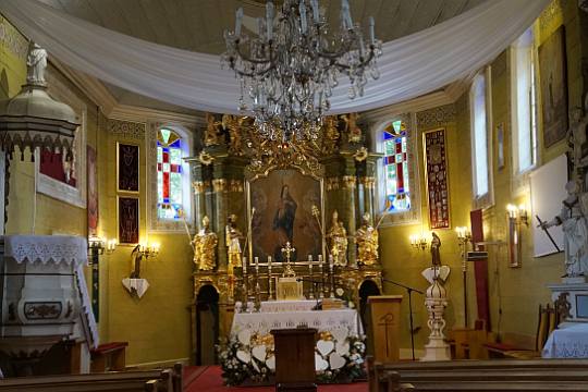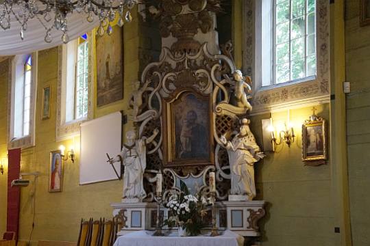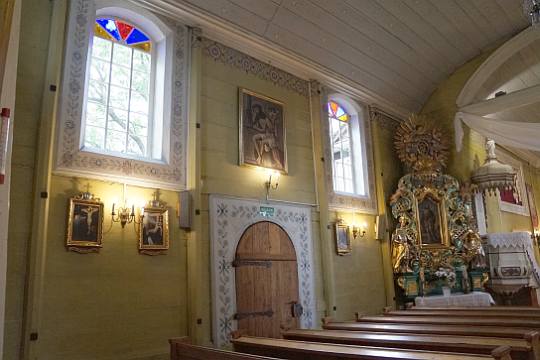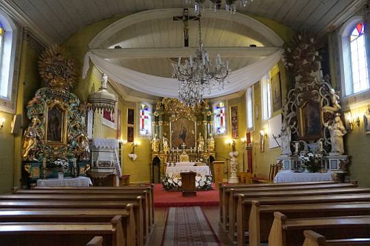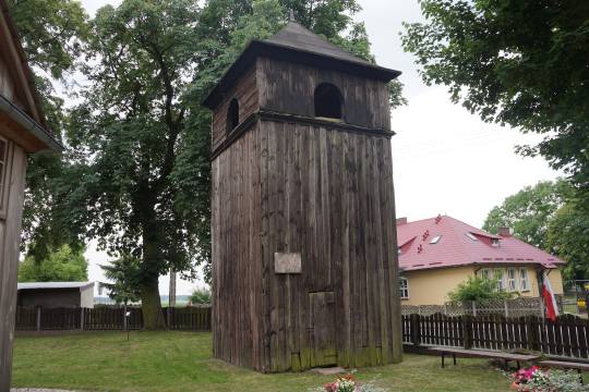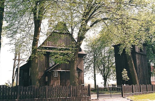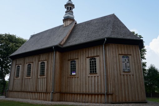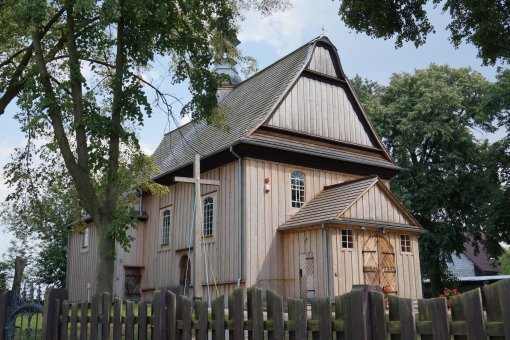 (fot. Brygida Kicińska - 2018) Położenie. Wieś gm. Lisków, ok. 30 km na pn. – wsch. od Kalisza. Historia. Kościół p.w. Niepokalanego Poczęcia NMP z 1754 r. Zbudowany z fundacji Ignacy Zaremba starościca prośniatyńskiego i księdza Jana Brańskiego. Remontowany z dodaniem kruchy i przemalowaniem wnętrza w latach 1882 – 85 r. Gruntownie odnowiony w latach 1968 – 69 przez mistrza ciesielskiego Aleksego Zielińskiego. W 1973 r. malowanie wnętrza przez Henryka Domurata. Remontowany w 1992 i 2007 r. Budowa i wyposażenie. Kościół drewniany, jednonawowy konstrukcji zrębowej. Orientowany. Mniejsze prezbiterium od nawy, zamknięte trójbocznie z boczną zakrystią z lożą kolatorską na piętrze. Kruchta od frontu nawy. Dach dwukalenicowy, kryty gontem z sześcioboczną wieżyczką na sygnaturkę. Zwieńczoną barokowym hełmem blaszanym z latarnią i krzyżem. Wewnątrz pozorne sklepienie kolebkowe. Chór muzyczny wsparty na dwóch słupach, o falistej linii parapetu z późnobarokowym prospektem organowym z 2 poł. XVIII w. Belka tęczowa z barokowym krucyfiksem. Podłoga z desek. Polichromia na sklepieniu prezbiterium w postaci medalionu i ozdobnego pasu ornamentalnego w formie gzymsu wzdłuż ścian. Ołtarz główny i dwa ołtarze boczne, ambona i chrzcielnica (w kształcie kielicha) późnobarokowe z 2 poł. XVIII w. Obrazy z 2 poł. XIX w., autorstwa Bartelmana w ołtarzach bocznych. Okazała dzwonnica drewniana z 1 poł. XVIII w. Zbudowana na planie kwadratu, kryta blaszanym dachem namiotowym. Dzwon z 1960 r. Plebania murowana z poł. XIX w. Ogrodzenie z słupkami betonowymi i sztachetami drewnianymi. Także warto zobaczyć. Wiatrak koźlak z 1807 r. Literatura. [1][2][6] |